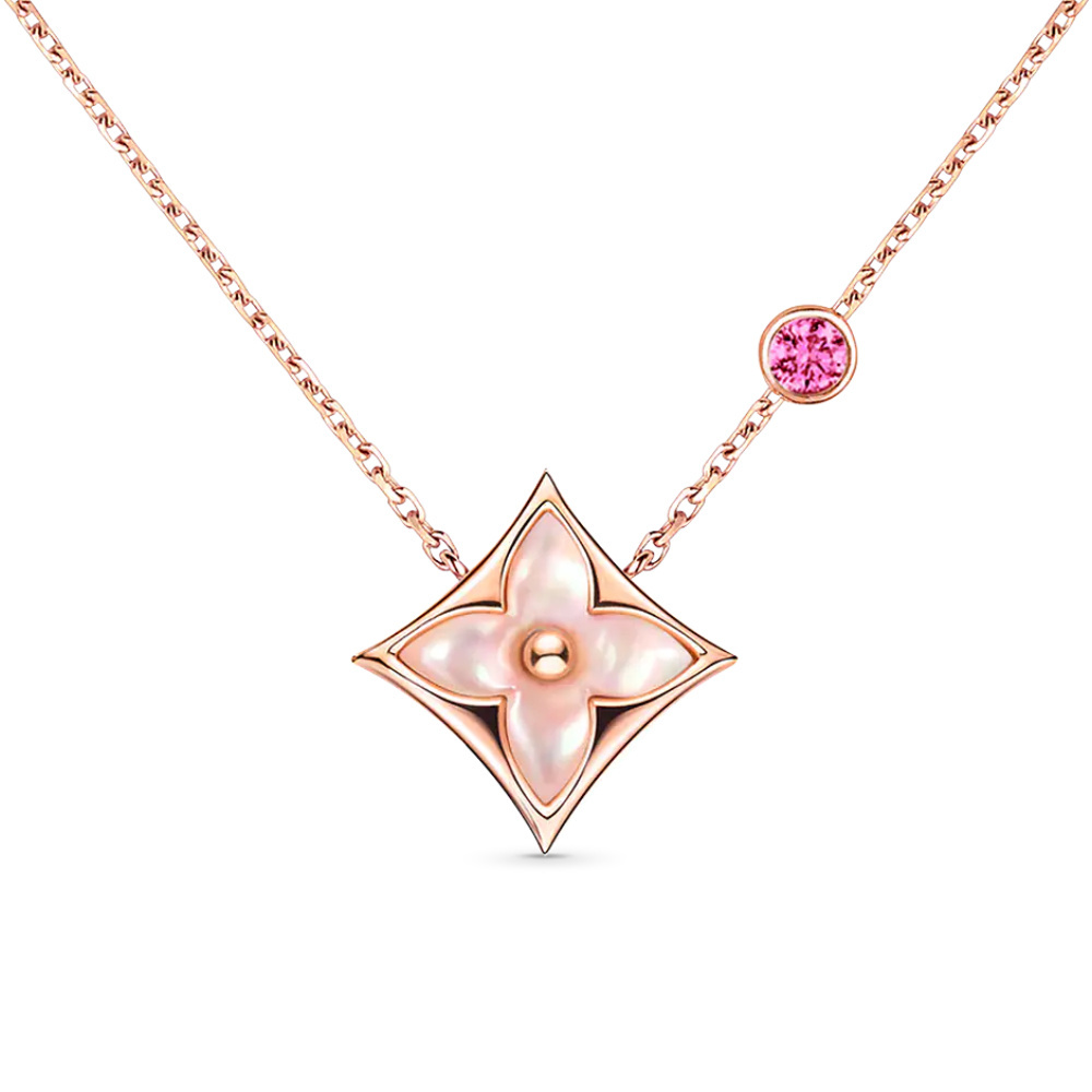为庆祝2024年中国七夕恋人节,Louis Vuitton 尤其推出一件 Color Blossom 项链新作,依然以玫瑰金及钻石塑造标记性 Monogram 花草图腾,尤其的地方是颈链镶嵌一颗圆形敞亮切割粉色蓝宝石,表达恋人节的浪漫爱意。